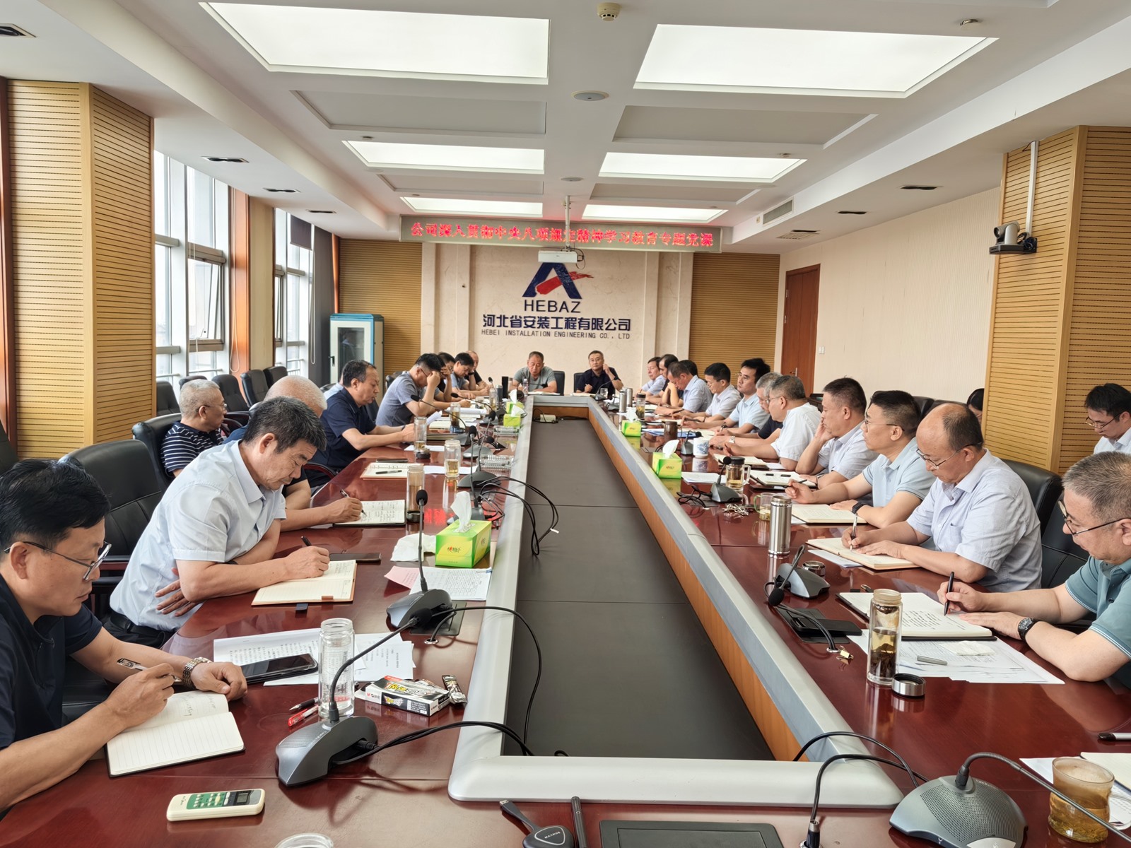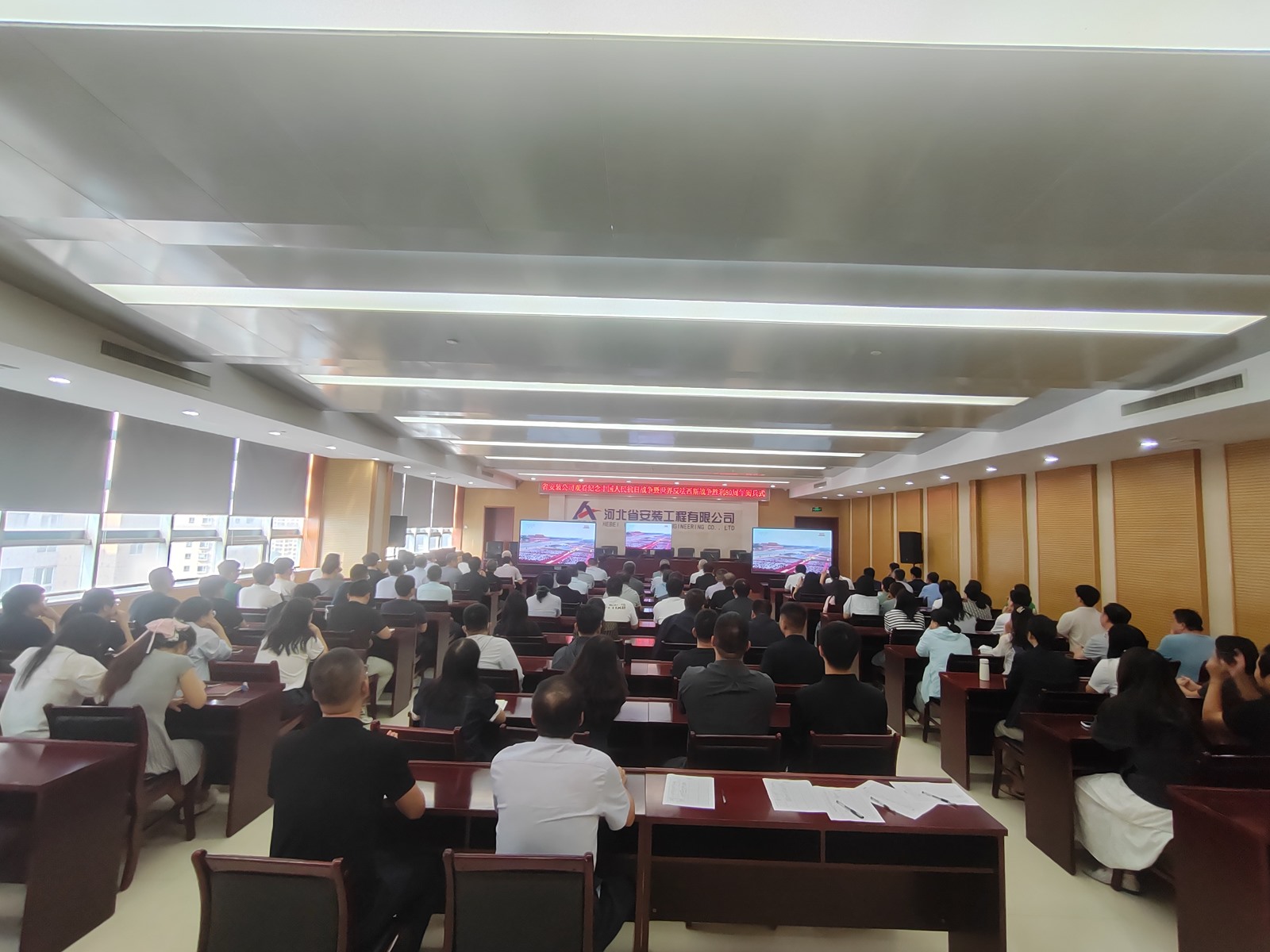 2025年9月3日,為紀(jì)念中國人民抗日戰(zhàn)爭暨世界反法西斯戰(zhàn)爭勝利80周年,河北省安裝工程有限公司積極組織職工集中觀看閱兵盛況直播。公司機關(guān)及各分公司、項目部共計2000余人通過多種方式同步參與,共同回顧歷史、緬懷先烈、展望未來。上午9時,習(xí)近平總書記發(fā)表重要講話,9時19分大閱兵正式開始,公司機關(guān)及各分公司、項目部會議室座無虛席,職工們們整齊地坐在屏幕前,神情莊重地注視著電視畫面。在閱兵式過程中,